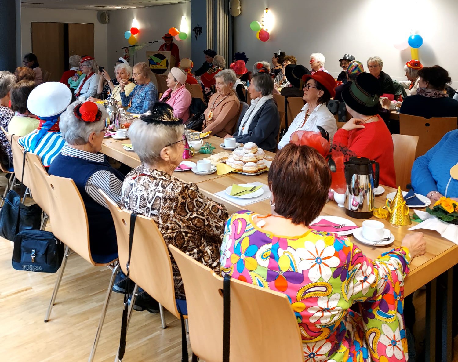 Mit 2 Wochen Verspätung wegen des Schneechaos Ende Januar öffneten sich nach dem mit unserem Pfarrer Erich Sauer gefeierten Gottesdienst die Türen des Haibacher Pfarrsaals am 10.02. zum fröhlichen Faschings-Nachmittag. Empfangen wurde jeder Gast mit einem Orden um den Hals. Schnell waren die ca. 60 Stühle besetzt, und schon während Kreppel, Kuchen und Kaffee an der bunten Tafel genossen wurden, stiegen die Ersten in die Bütt‘ : Über geforderte Eintrittskarten mit QR-Code auf dem Smartphone wurde lautstark lamentiert. Eine Oma wird auf dem Dachboden in einer Kleider-Kiste fündig und führt interessante „Unterwäsche“ vor. Eine „Hawischer Ortsbus“-Fahrerin erzählt Anekdoten von ihren Fahrten mit teils illustren Passagieren. Die „,Altbürgermeisterin“ hat große Sorge, was aus ihrem Titel wird, wenn Bürgermeister Zenglein diesen bald übernimmt. Eine Rentnerin erzählt mit Stolz aber auch mit Wehmut aus ihrem Leben und dass früher nicht alles schlechter war. Viel zu schnell vergingen die Stunden; dazwischen wurde gesungen, geschunkelt und mit einem Gläschen Sekt und Snacks die ‚5 Jahreszeit‘ fröhlich gefeiert. Mit einer großzügigen "Hutsammlung“ bedankte sich Heidrun Schmitt bei unserem 6-köpfigen Pfarrcafé-Team für das ganzjährige Engagement. Diese Wertschätzung wurde von uns gerne entgegengenommen.