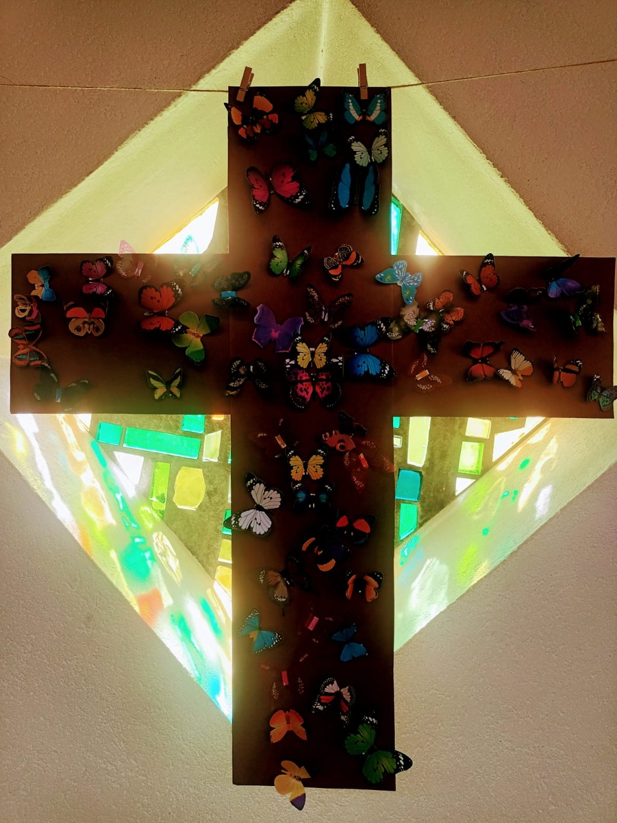 Zum Schluss durfte jedes Kind einen gebastelten Schmetterling auf ein Kreuz kleben: so entstand aus einem Symbol von Tod und Trauer ein Zeichen des Lebens und der Hoffnung!