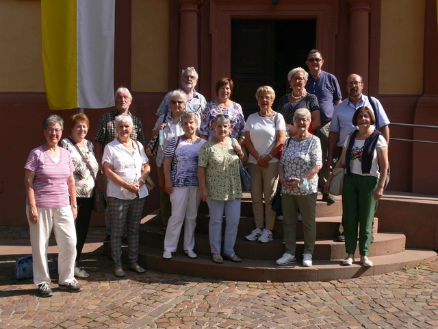 Zeit, um den ehrenamtlichen Helfern Danke zu sagen. Doris plante mit Unterstützung von Herbert für den 19.07.2023 eine Überraschungsfahrt. Abfahrt war um 13.00 Uhr an der Kirche. Schade war, dass wir nur 11 Personen waren. Mit 3 PKW ging die Fahrt Richtung Mespelbrunn. Der erste Stopp erfolgte am Parkplatz von Doris Zahnarzt um - in die Maximilian Kolbe Kirche zu gehen. Pfarrer Erich Sauer hält eine schöne Andacht und informiert uns über das Leben und Sterben von Maximilian Kolbe.
